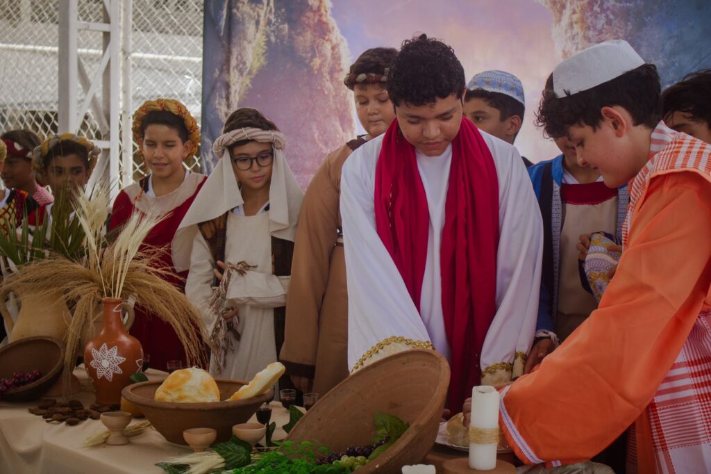 A narrativa da morte e ressurreição de Jesus foi o eixo central do evento, com o amor e a bondade emergindo como temas principais. A dramatização do sacrifício de Jesus se desdobrou em cenas tocantes, culminando em uma recriação da Última Ceia. Nesse momento, a ênfase foi colocada no valor da partilha, especialmente significativa para as crianças.